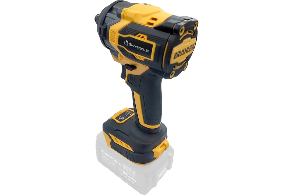 Аккумуляторный ударный гайковерт SKytools SK9002 оснащен бесщеточным двигателем большой мощности. Благодаря бесщеточной технологии, удается существенно увеличить производительность инструмента. Данная модельа поставляется без аккумуляторов и зарядного устройства. Максимальный крутящий момент, не смотря на его компактные габариты, составляет 550 Нм. На корпусе инструмента расположена регулировка (индикатор) крутящего момента. Данный индикатор имеет 3 режима регулировки: 280Нм/400Нм/550Нм. Так же при включенном реверсе, можно установить режим "рывка". В обычном режиме реверса - гайковерт просто крутит непрерывно, а в режиме "рывка" - он останавливается при откручивании. Корпус гайковерта выполнен из высококачественного пластика, рукоятка обрезинена, имеется подсветка рабочей зоны. Размер патрона - 1/2 дюйма. Аккумуляторная база взаимозаменяема со всей новой линейкой аккумуляторного инструмента торговой марки SKytools (SK9002, SK9002-1, SK9004, SK7005, SK126, SK126-1, SK65, SK129, SK303, SK7007, SK7006, SK9005)