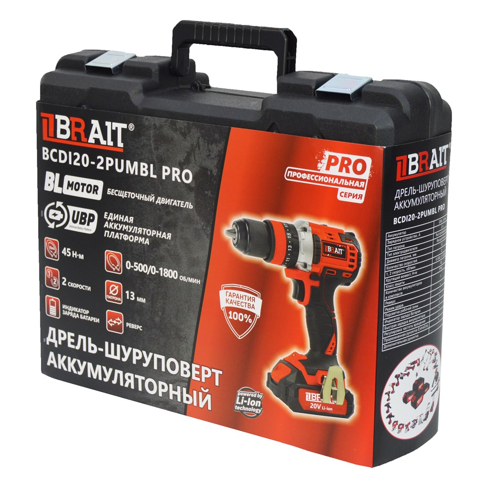 Дрель аккумуляторная BCDI20-2PUMBL PRO (20В, 1 АКБ.2,0Ач,быстрозажимной патрон,2 ск,45Нм,индикатор заряда батареи,патрон 13мм) 4шт/кор 80шт/подд