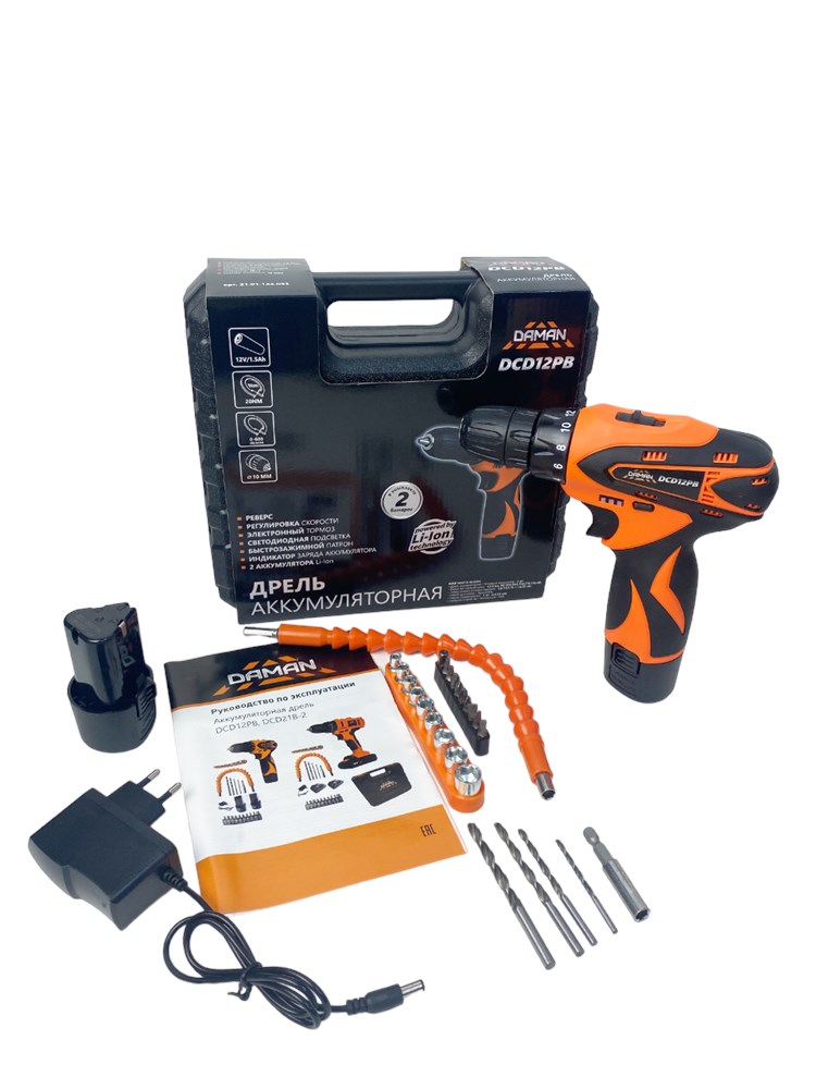 Оформление под заказ - Дрель аккумуляторная DCD12PB DAMAN(12В,Li-on,2 АКБ,З/У,кейс,1,5Ач,1ск,20Н-м,индикатор заряда,быстрозажим.патр,комплект насадок)10шт/кор 200/240шт/подд