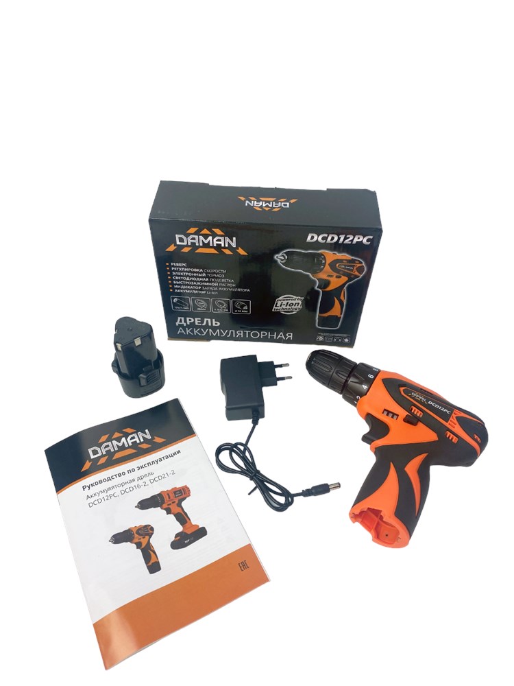 Дрель аккумуляторная DCD12PC DAMAN (12В,Li-on,1 АКБ,зарядка,1,5Ач,2ск,28 Н-м,индикатор заряда,быстрозажимной патрон,в коробке) 20шт/кор 400шт/640/подд