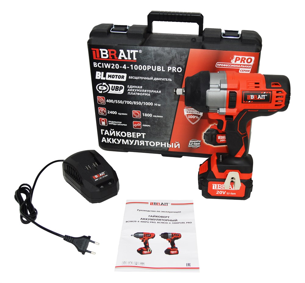Гайковерт аккумуляторный BCIW20-4-1000PUBL PRO (20В,1АКБ,4Ач,1зарядка,2.4A,400/550/700/850/1000Н-м, 1800об/мин,2400уд/мин,кейс) 80/120шт/подд 4шт/кор
