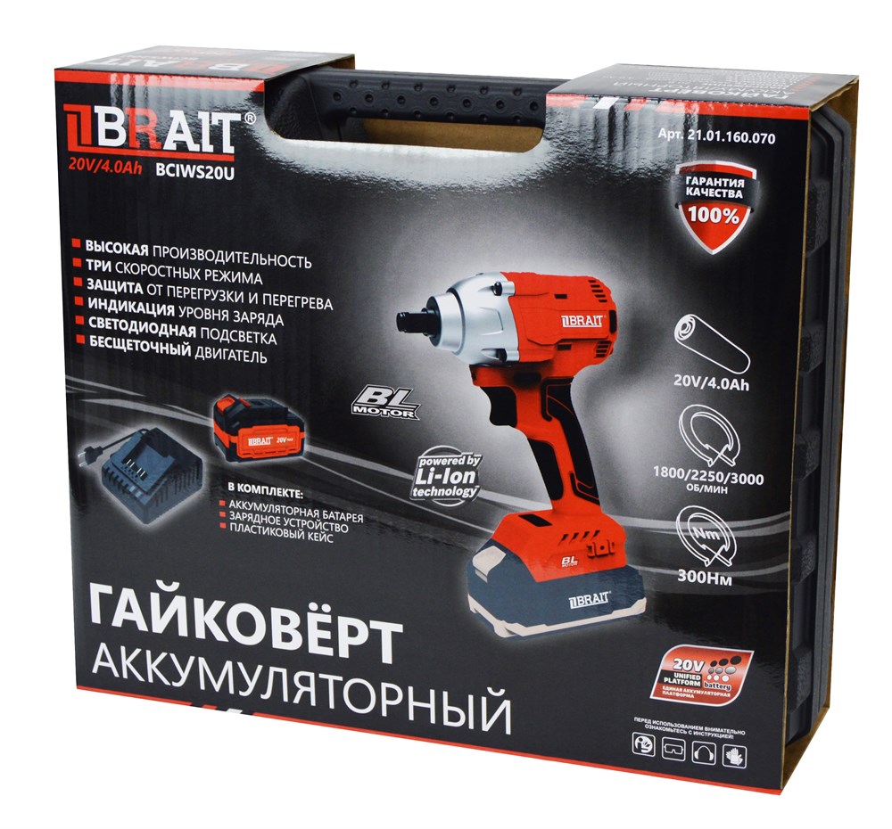 Гайковёрт аккумуляторный BCIWS20U (20В,1 АКБ,1 З/У,кейс, бесщёточный дв., обор.:0-3000,голов.12,7мм(1/2"), 300Н.м) 5шт/кор, 100шт/поддон