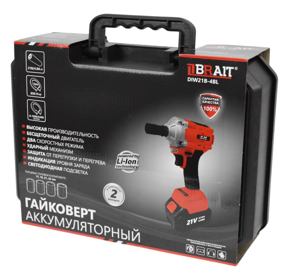 Гайковёрт аккумуляторный DIW21B-4BL (21В;обороты - 0-1900/0-2400;головка 22мм (1/2"),З/У-2.0А;АКБ-4Ач;крут. момент-650 Нм) 8шт/уп, 104шт/под