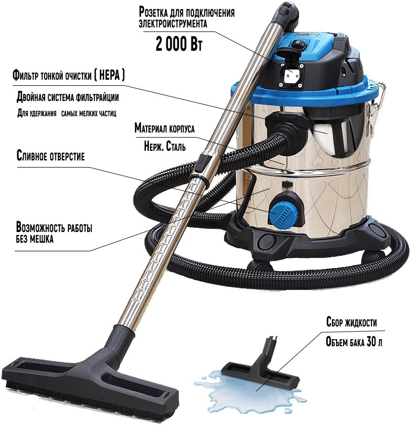 Функция дренажа позволяет слить воду без разборки технического пылесоса, достаточно открыть сливное отверстие и просто слить собранную жидкость.