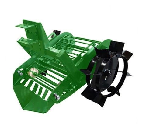 Картофелекопалка является навесным оборудованием к мотоблокам. Изделие применяется для выкапывания клубней картофеля механическим способом с последующим отсевом земли и выкладыванием клубней на поверхность почвы. Рекомендуется для использования на легкой почве. Картофелекопалку составляют следующие элементы: корпус, транспортер, нож (рыхлитель), грунтозацепы, колесная ось и валы транспортера