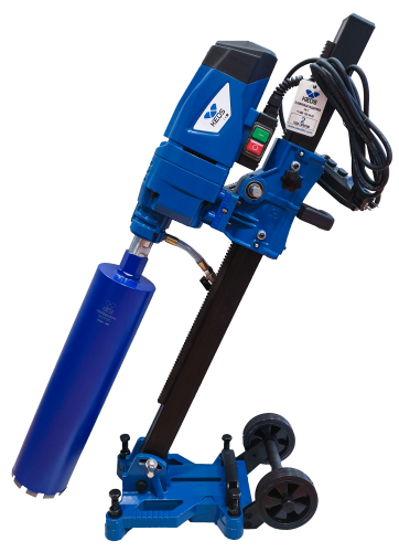В комплект входит штатив с возможностью регулировки угла наклона в диапазоне от 0 до 45 градусов. Простая регулировка и фиксация угла осуществляется с помощью двух болтов, что обеспечивает гибкость в работе. Для удобства перемещения по строительной площадке, даже с уже установленным мотором и коронкой, комплект оснащён транспортировочными колёсами.