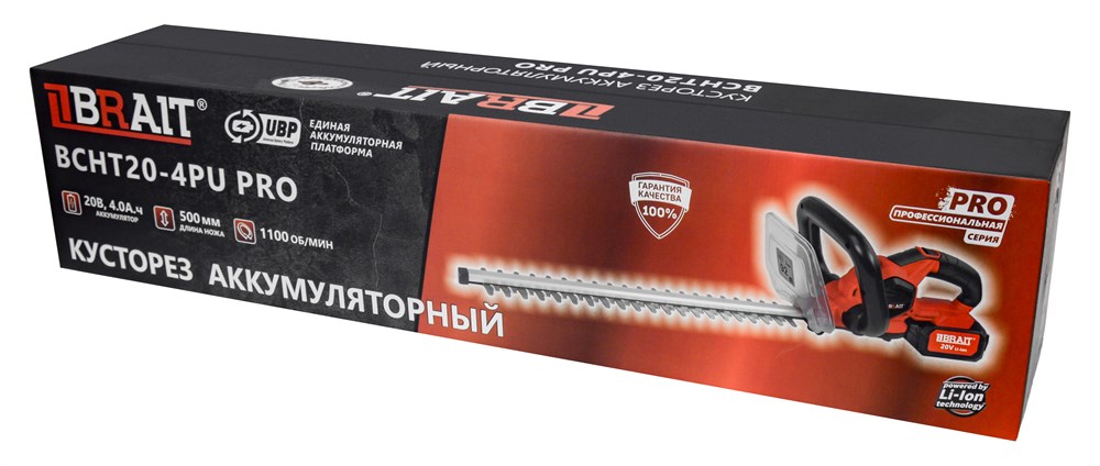 Кусторез аккумуляторный BCHT20-4PU PRO (20В,Li-ion,АКБ 4.0Ач, З/У 2.4А,1100об/мин,нож 500мм,электронный тормоз,рабоч. длина 440мм) 2шт/кор 42шт/подд