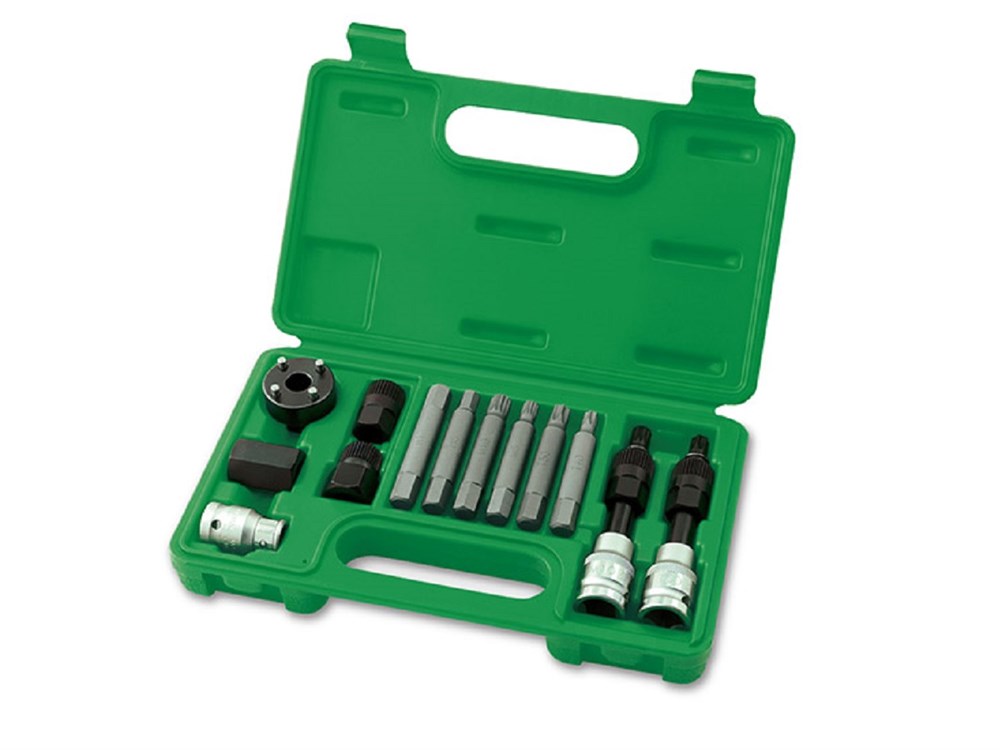 Набор TOPTUL из 13 предметов предназначен для съема шкивов генераторов как в демонтированном состоянии, так и установленных на автомобиле. Рекомендуется для профессионального использования.