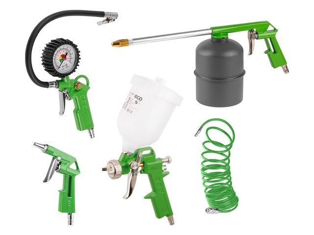 Базовый набор пневмоинструментов, состоящий из популярных компонентов, которые пригодятся начинающему пользователю воздушного компрессора. В набор входит краскораспылитель типа HVLP, пистолет моечный для мойки поверхностей моющими составами, пистолет для подкачки шин с манометром, продувочный пистолет для очистки поверхностей от пыли и сухой грязи и спиральный пневматический шланг для подключения аксессуаров к компрессору.