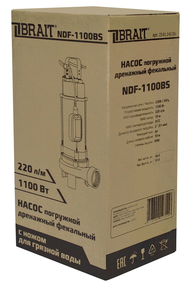 Оформление под заказ - Насос дренажный погружной NDF-1100BS (220л/мин; 1100Вт; макс. напор 10м; частицы до 25мм,нож для дробления фракций)45шт/подд
