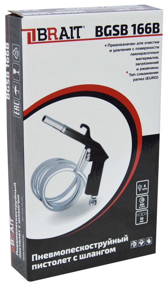 Пневмопескоструйный пистолет с шлангом BGSB 166B для возд. компрессора (8атм, 300л/мин., диаметр сопла 10 мм) 36шт/кор