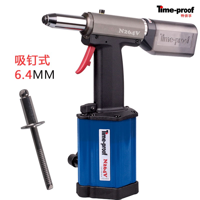 Пневмогидравлический заклепочник Time-proof N264V — инструмент для монтажа вытяжных заклепок диаметром от 4,0 до 6,4 мм, из всех материалов, таких как: сталь, нерж.сталь, алюминий. Данная модель предназначена для промышленного использования и отлично подходит для предприятий, где требуется устанавливать большое количество заклепок. Рабочий ход составляет 18 мм. В данной модификации заклепочника N264 предусмотрена функция ваккумного удержания заклепки в наконечнике инструмента и принудительного выброса оторванного стержня в накопительный резервуар. Инструмент поставляется в алюминиевом кейсе.